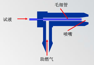 试液雾化后,进入雾化室,与燃气在室内充分混合,之后进入燃烧器燃烧。较大的雾滴凝结后,从下端的废液管中排出。